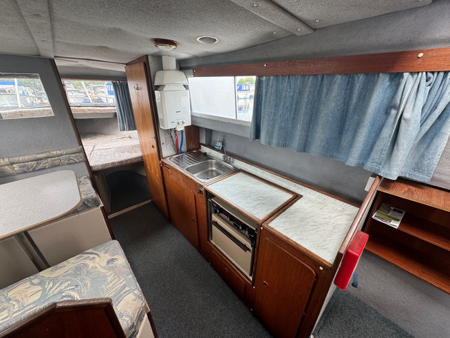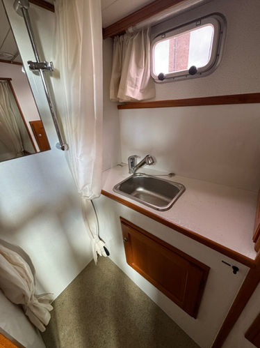 The carpentry on the steins is very well built, offering lots of storage everywhere possible, the accommodation is very light and bright with all round windows, in the saloon and the galley, the upholstery is in excellent condition, the boat is equipped with a gas Paloma instant hot water heater, a Mikuni diesel hot air blower throughout the boat, the galley has a 4 burner gas hob, and oven, stainless steel single bowl sink, and a Electrolux Duel fuel fridge with ice box, the bathroom houses a Jabsco sea toilet with additional holding tank, vanity unit and sink and wall mounted shower head.