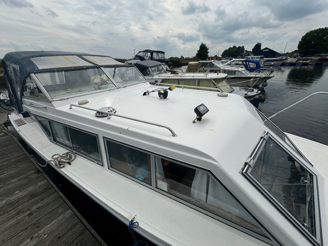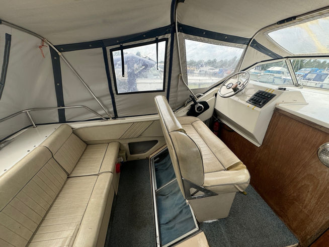 FREEMAN 23, Aft cockpit river cruiser, 1974, fitted with WaterMota Sea Wolf Crossflow 30Hp petrol engine, with J-Type Gearbox, this very well maintained example all in original condition, this versatile 4 berth popular river cruiser known for its classic design, which is perfect for weekend getaways, with an open and inviting cockpit with ample seating, perfect for socializing or enjoying the views, with a full canopy for weather protection, it has a spacious V berth at the bow with closing door, a convertible dinette, and separate small bathroom housing a thetford Porti Potti, the galley is equipped with a Flavel Vanessa twin gas hob/grill and a stainless steel sink.