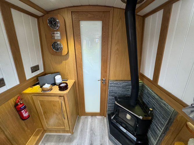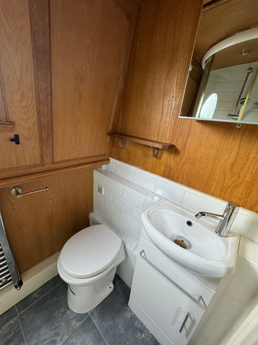 This is a good quality fit out, in solid oak throughout, with the benefits of double glazed windows fitted in 2020, Vetus Bow Thruster, Victron 3Kw Inverter/Charger, solar panels, Morso solid fuel stove, LeeSan Macerating toilet with holding tank, Sky light in main bedroom, side hatch in galley, Boat Safety Cert till Oct 2026